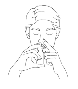 3. Tartsa az üveget függőlegesen úgy, hogy a hüvelykujjával alul megtámasztja, az orrfeltétet pedig két ujja közé veszi. Hajoljon enyhén előre és helyezze az orrfeltétet az egyik orrlyukba.